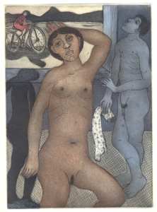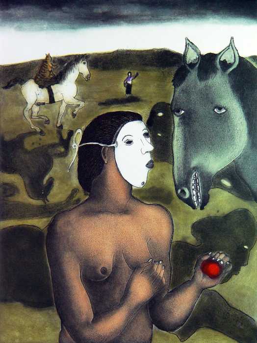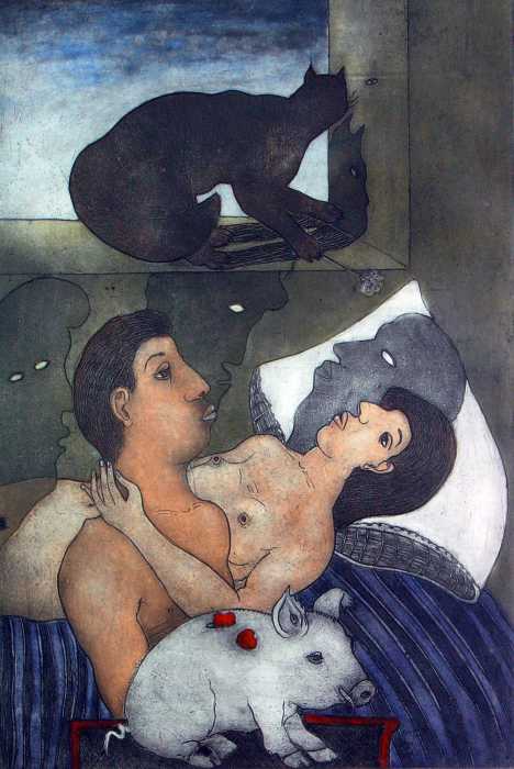 La mirada de Luis Valsoto se disuelve en contornos que corresponden a la asimetría de la cotidianeidad: el amor perpetrado bajo la complicidad de un caballo, un gato, un perro que arrastran su propia sombra sobre el tapiz del lienzo. El color, la luminosidad, como elementos tránsfugas de lo establecido bajo la simulación del extravío, incorporan formas adyacentes que connotan el hallazgo de una identidad cultural sin caer en la obviedad.Luis es un grillo apasionado, como todos los que conforman esta Torre, no obstante que él mismo se considere un poco más pintor que grabador. Su obra carga desde un atisbo de lascivia hasta la contemplación erótica del más puro ejercicio doméstico, por eventual o expedito que parezca, entonces el desnudo más osado se vuelve fractal en toda su obra, qué decir de inequívoco, oportuno, dichoso. L ui s V a l s o t o (1939, México, DF) Tiene ascendencia del norte de México (Durango), hizo estudios de arquitectura y cursó algunos diplomados en óleo y grabado en California, e. u. a., donde residió durante cuatro años. Su trabajo se ha expuesto en sus más de cuarenta exposiciones, tanto individuales como colectivas, a lo largo de su trayectoria; entre de los múltiples espacios que han colgado su obra destacan el Instituto Cultural Cabañas de Guadalajara, Jal., México; el Palacio de Bellas Artes, el Colegio de San Ildefonso, de la ciudad de México; el museo marco de Monterrey, Nvo. León, México; y la Capricorne Asourne Galery de San Francisco, Cal., en e. u. a. Contacte a Luis Valsoto : Tel. 52+33+3613-4689 jac@elcalamo.com |